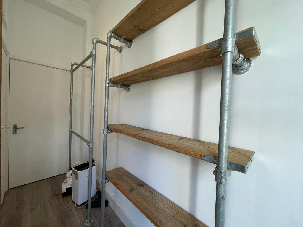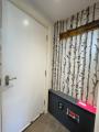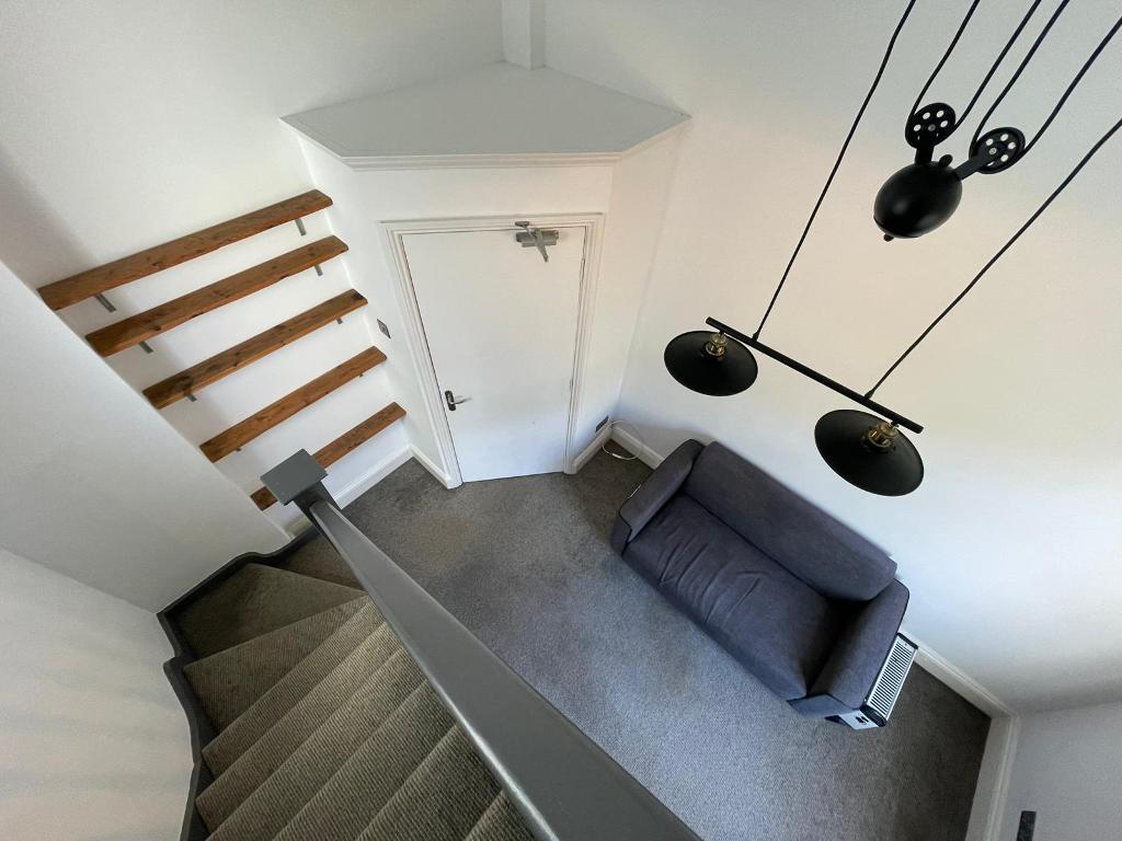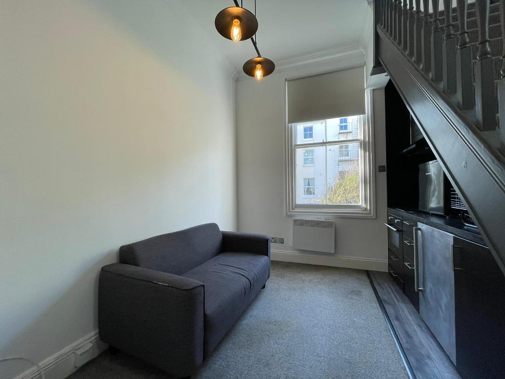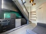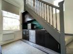 The property features an inviting entrance area with storage for coats and shoes, leading to a bright open-plan living area with high ceilings, modern lighting, and a large west-facing window. The sleek kitchenette, tucked neatly beneath the stairs, includes an integrated oven, hob, and fridge-freezer.