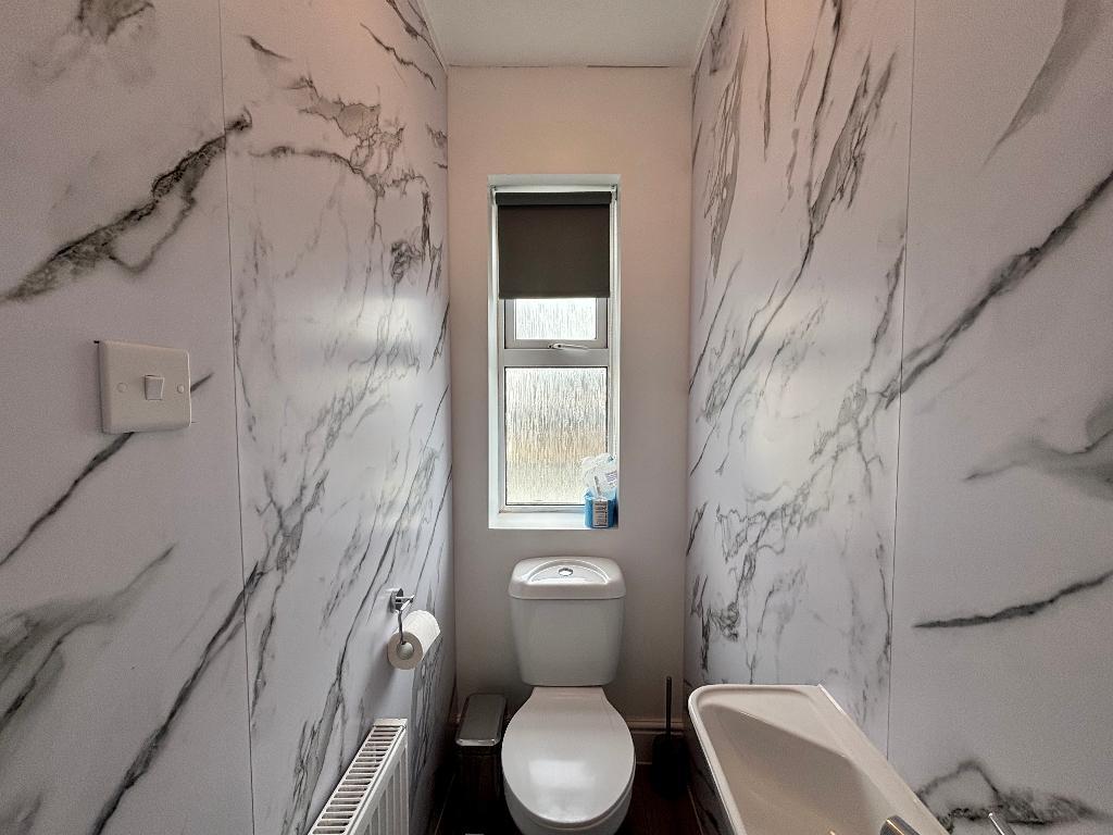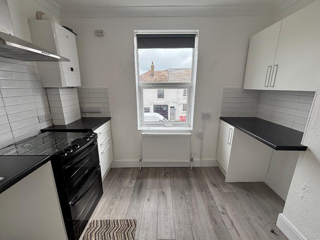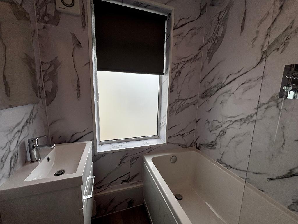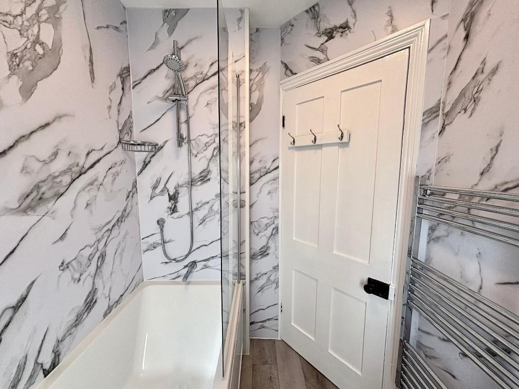 A flight of stairs leads you up into the property the kitchen is located at the rear of the building and has space for appliances as well as a dining table. Next is the family bathroom finished in a neutral white having a bath with shower, hand wash basin and separate W/C.