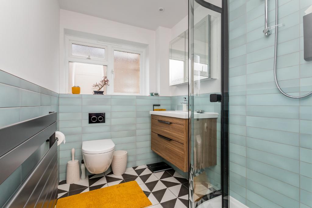 The modern fitted kitchen has high gloss white units with a modern grey worktop, there is an integrated gas hob, electric oven, space for a washing machine and fridge freezer. Next is the newly fitted shower room which has a walk in shower finished in contemporary black, there is a wall hung sink, W/C, towel rail and mirrored vanity unit.