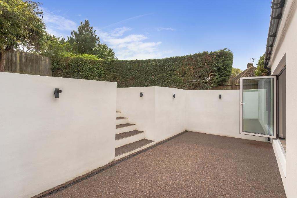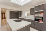 The living room provides a great space to unwind and has contemporary glass sliding doors which slide and hide in the walls separating it from the extended dining area. The kitchen has had a 4 meter extension allowing for a central island with breakfast bar and large dining space with bi-fold doors leading on to the garden. The kitchen has modern handless units finished in matt grey and a contrasting white marble effect worktop with glass up stand. There is an integrated oven, microwave, induction hob with downdraft extractor, fridge freezer and a dishwasher. There is also a hidden utility room which has storage cupboards and space for a washing machine / tumble dryer.