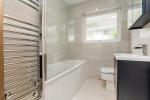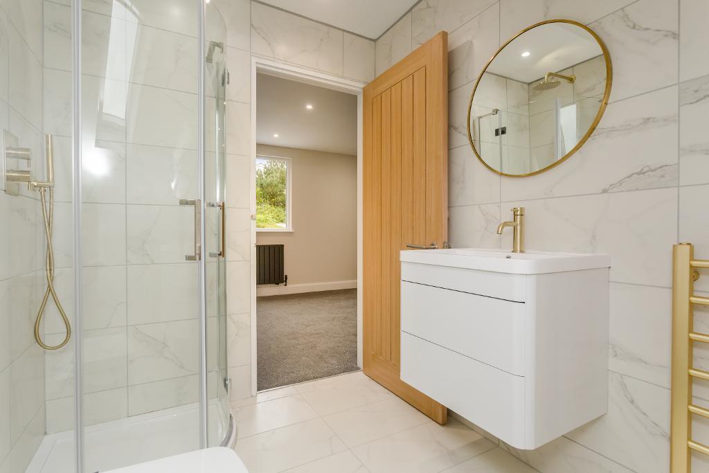 Next is the modern family bathroom which has been fully tiled in a luxury white marble effect tile, there is a bath with shower over, w/c, vanity unit and fitted wall mirror.