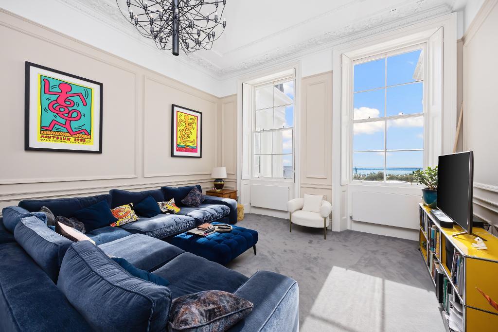The living room is located towards the front of the property with expansive space and breathtaking details create a truly awe-inspiring setting. This large lounge boasts soaring high ceilings, direct sea views, a stunning feature fireplace and offering a remarkable sense of room and light, with retained period detailing adding to the charm.