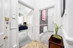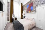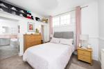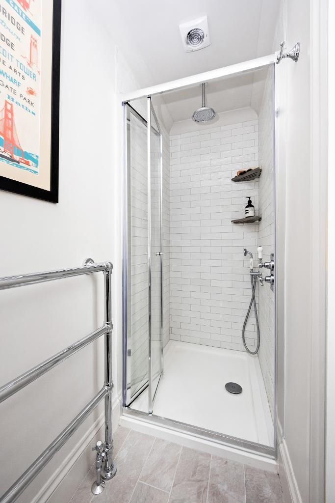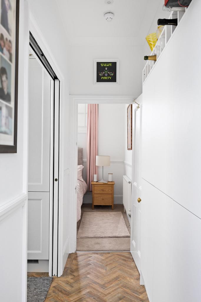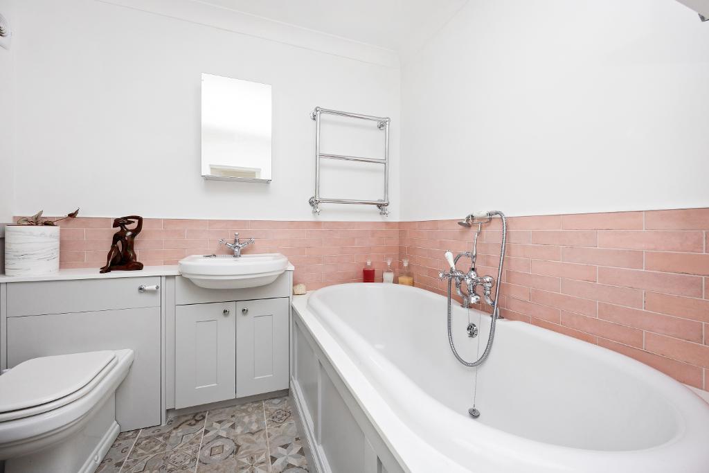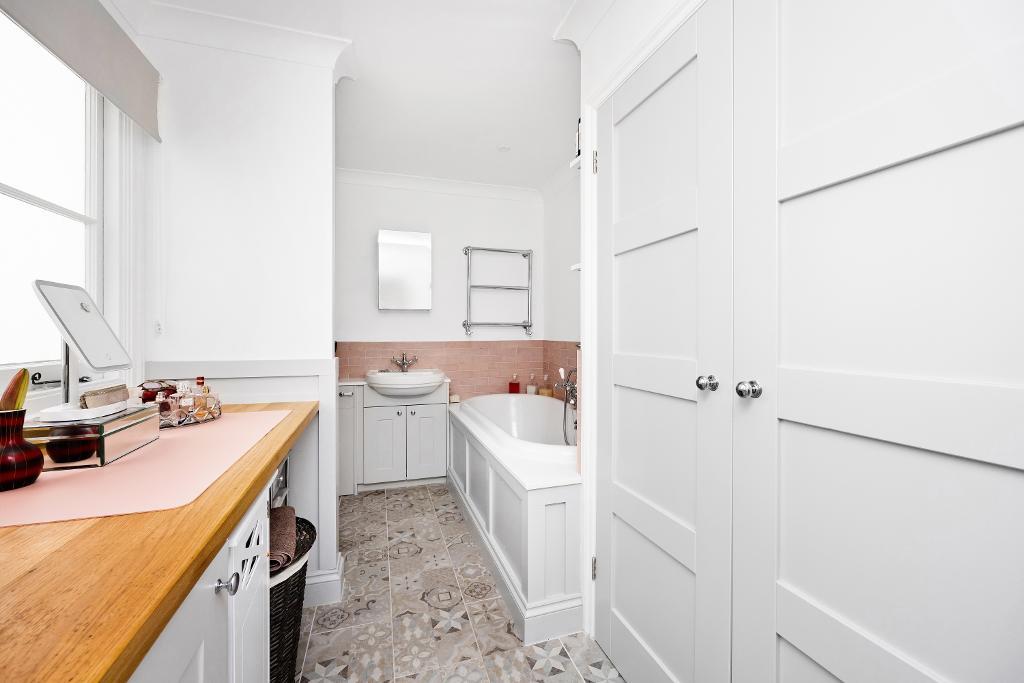 The second bedroom is located towards the rear of the property, a large double enjoying plenty of natural light, high ceilings enough space for a freestanding wardrobe or desk, over head storage shelves and a very cool concealed ensuite bathroom. With a very inviting double ended bathtub, stylish wooden panelling surround, pretty pink wall tiles, victorian style floor tiles, heated towel rail, WC and small utility space housing an integrated washing machine.