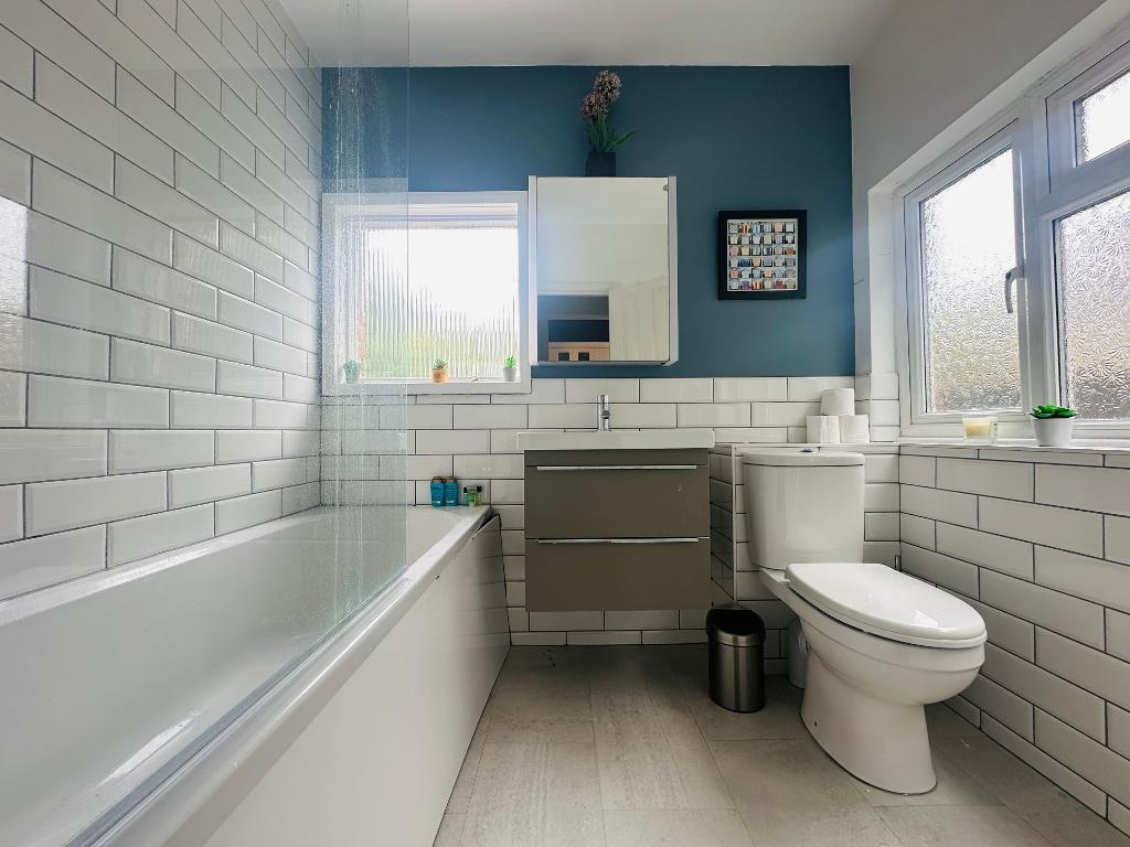 The modern family bathroom is designed with comfort in mind, offering a full-sized bath with a luxurious rainfall shower, W/C, basin, and a heated towel rail.