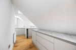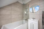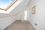 The main living space is bright and well-proportioned, with an open-plan layout that includes a modern kitchen, dining area, and lounge zone. Large Velux-style windows flood the interior with natural light, while the sleek kitchen features contemporary units, integrated appliances and practical storage.