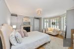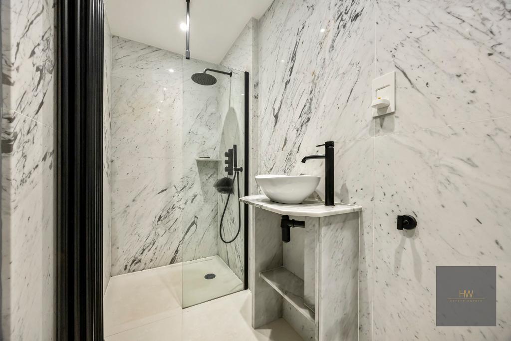 The generous living room sits at the heart of the flat, with its large bay window and doors leading directly to the garden, flooding the space with natural light. A contemporary kitchen provides excellent storage and workspace, while two double bedrooms and a separate office ensure flexibility for families, guests or those working from home. The bathroom is finished in marble with sleek modern fittings, adding a touch of luxury to the home.