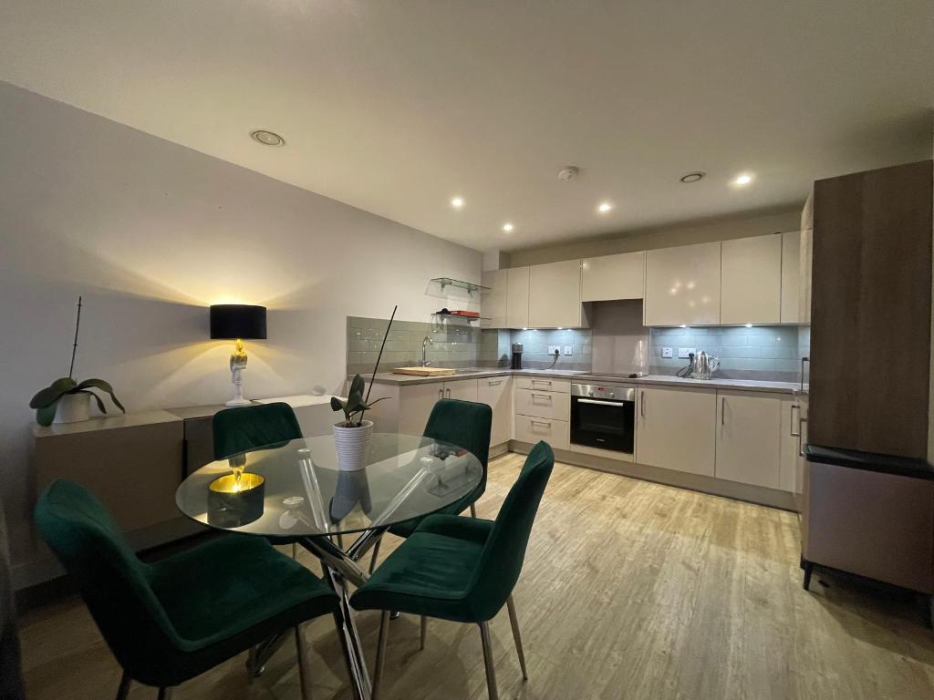 The sleek, fully fitted kitchen features high-spec integrated appliances, ample storage, and elegant work surfaces, making it a pleasure to prepare meals at home. Two spacious double bedrooms provide comfortable sanctuaries, each furnished to a high standard. The principal bedroom boasts a luxurious en-suite shower room, finished with modern fixtures and a sophisticated palette. The second bedroom is equally well-proportioned and served by a stylish family bathroom, complete with contemporary tiling and quality fittings.